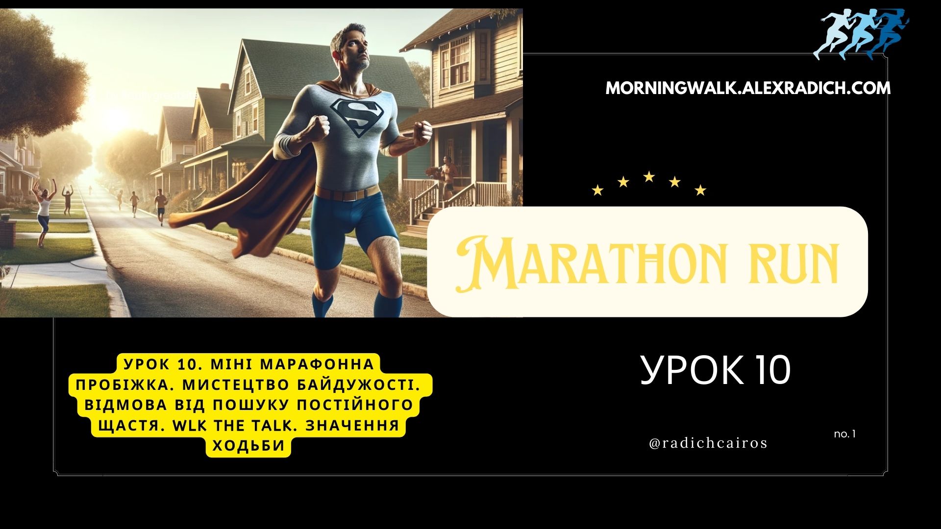 У десятому уроці курсу основна увага була зосереджена на марафонній пробіжці та ролі філософії руху в повсякденному житті. Учасники курсу були заохочені до тривалої пробіжки, де швидкість була не так важлива, як процес та власні відчуття. Урок включав роздуми про байдужість відповідно до ідей Марка Менсона, акцентуючи на важливості зосередження на тому, що дійсно має значення.